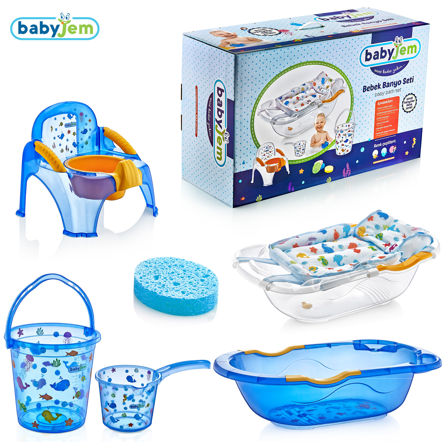 Şık hediyelik kutusunda satışa sunulan babyjem banyo seti içerisinde 1 adet giderli şeffaf desenli banyo küveti , 1 adet şeffaf desenli 10 lt banyo kovası , 1 adet şeffaf desenli banyo maşrapası , 1 adet köpüklü desenli küvet filesi, 1 adet selulozik banyo sünger, 1 adet şeffaf desenli afacan lazımlık mevcuttur. Kanserojen madde içermeyen 1.sınıf hammaddeden üretim yapılmıştır.