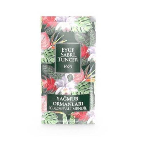 - 5 * 10 cm kapalı folyo içerisinde açık mendil ebatı 13*18 cm olan, özenle paketlenen birbirinden şık ambalajlar ile sunulan Eyüp Sabri Tuncer özel Yağmur Ormanları kolonyalı mendil serisiyle ferahlık ve hijyen her an yanınızda…