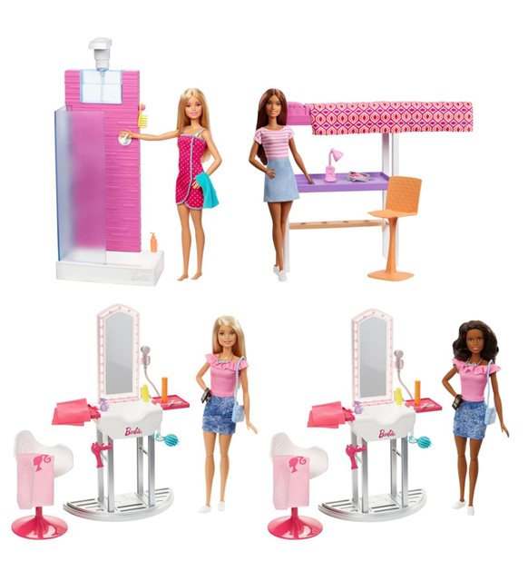 Barbie® Bebek ve Oda Setleri ile evcilik oyunlarına başka bir boyut getirmek senin elinde! Her oda kendine has tarzıyla farklı bir hikâye anlatır. Yeni hikayeler için parçaları istediğin gibi düzenleyebilirsin. Ofis, banyo, mutfak temalarından birini seç. Her biri mobilya, aksesuar ve temaya uygun tarzda bir Barbie® bebek içerir. Modern tasarımları, popüler renkleri ve göz kamaştırıcı özellikleriyle muhteşem mobilyalar. Gerçekçi detaylara sahip parçalar ile farklı farklı hikayeler yaratabilirsin. Barbie® bebek odaya ve anlatmak istediğin hikâyeye uygun olarak giyindi. Hayal gücünü geliştiren eğlenceli temalarla yaratıcılığını keşfet çünkü Barbie® ile her şey mümkün! Muhteşem mobilya ve aksesuarların tümünü koleksiyonuna ekleyerek Barbie® bebeğin hayatına renk kat. Her oyun setine; giysili ve aksesuarlı bir Barbie bebek, mobilya ve temalı aksesuarlar dahildir. Her biri ayrı ayrı ve stoklara bağlı olarak satılır. Bebekler tek başlarına ayakta duramazlar. Renkler ve süslemeler farklılık gösterebilir.
