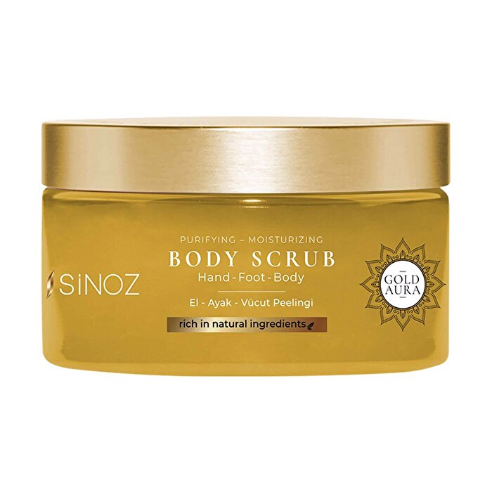 - Sinoz Gold Aura Vücut Peelingi; cildin ölü deri ve batıklardan arınmasına yardımcı olur.